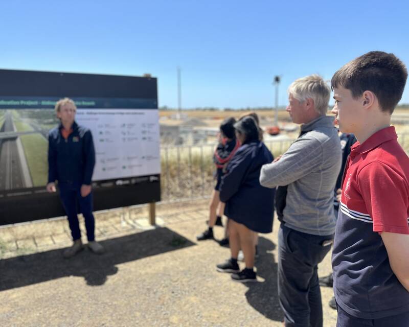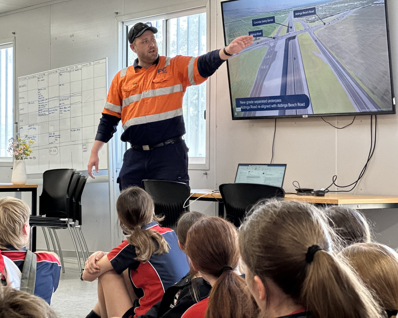 The college, located a short walk from the heart of stage 2 of the Main South Road duplication project, visited the Fleurieu Connections Alliance construction site and joined project staff for real-world learning activities. This included hands-on exploration of the Aldinga interchange and the broader duplication project extending from Aldinga to Sellicks Beach.