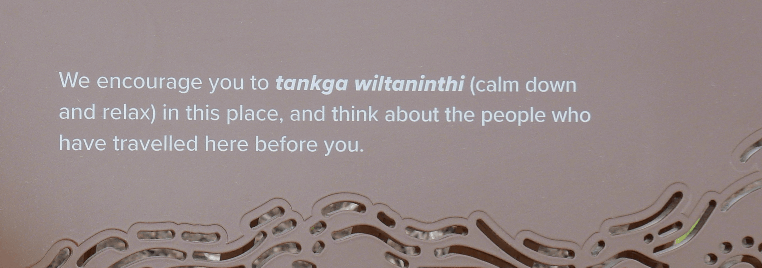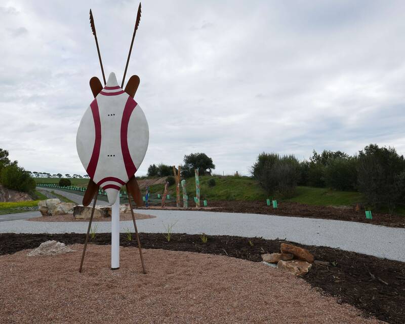 The rest node features important symbols of Kaurna culture, including the Kaurna shield. The shield is carved into a central sandstone rock and those who look closely will also see Kaurna words carved into rocks in the space.