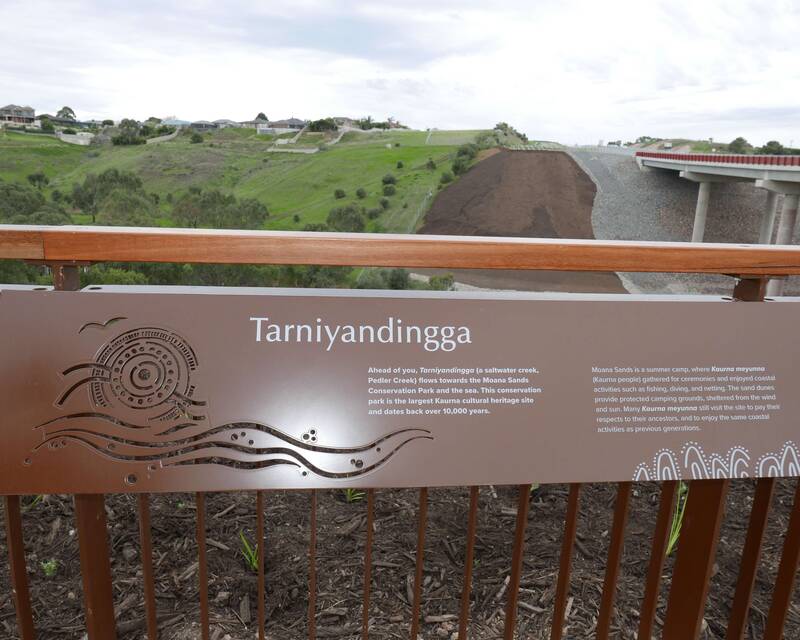 These new structures complement the artwork which adorns the project’s urban design elements such as the Tatachilla overpass, Pedler Creek bridge, Coast to Vines underpass. In addition, the Ngaltingga bridge at Port Road, Aldinga has been bestowed with the Kaurna name for the Aldinga area.