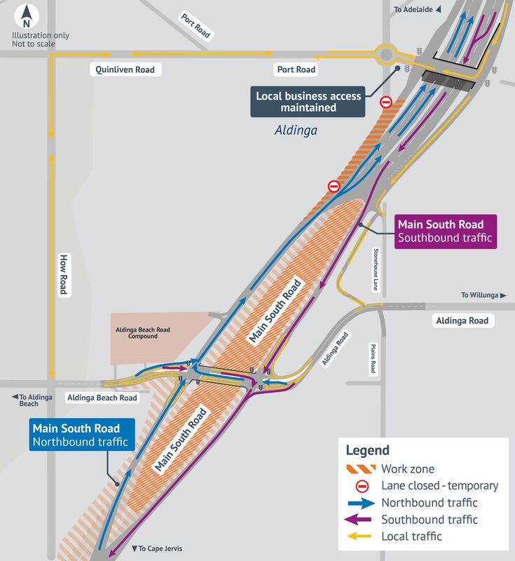 From 7pm Friday 7 November 2025 to 7am Monday 10 November 2025, the off ramp to Port Road at Aldinga, including the junction of Old Coach Road, will be temporarily closed (24 hours a day). A detour will be in place via Aldinga Beach Road, How Road and Port Road. Access to businesses on Old Coach Road and Port Road will be maintained at all times via Port Road. Please see below a detour map.