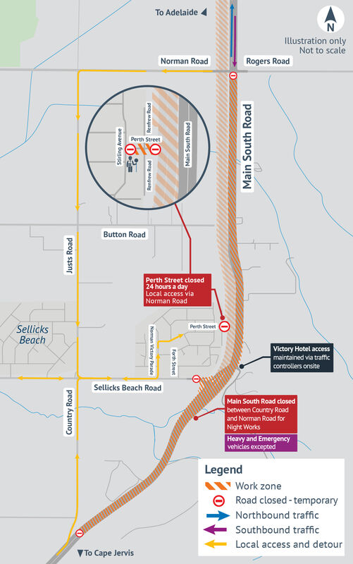 Between 7pm and 7am each night, Main South Road will be closed between Norman Road and Country Road. This will include the junction of Sellicks Beach Road and Perth Street. Please see map below.