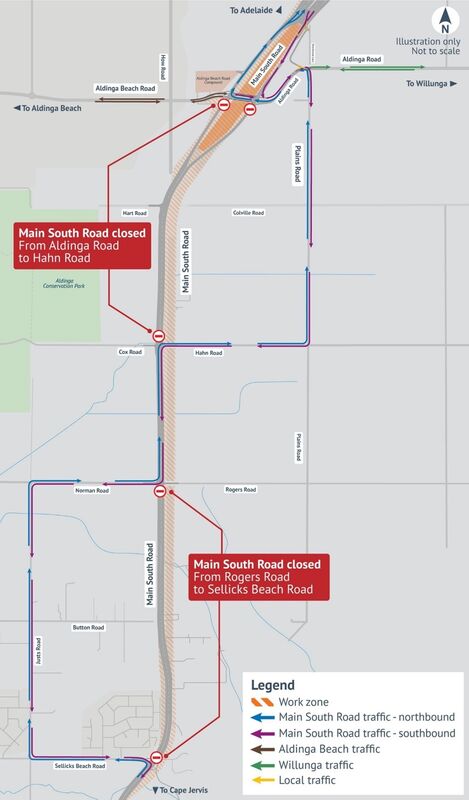 From 7pm Sunday 26 October, sections of Main South Road between Aldinga Beach Road and Sellicks Beach Road will be closed for night works, before traffic is moved to the southbound carriageway from 7am Monday 27 October 2025.During this closure a detour will be in place via Aldinga Road, Plains Road, and Hahn Road to Main South Road and then Norman Road, Justs Road and Sellicks Beach Road.
