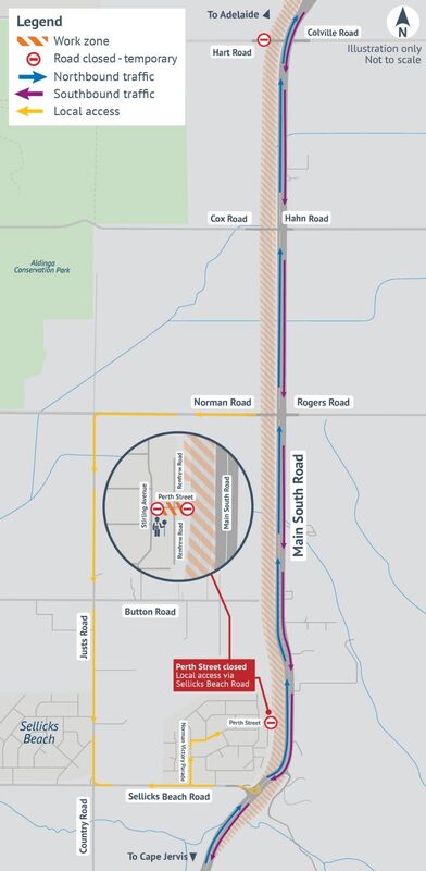 Work will be carried out along Main South Road between Aldinga Beach Road and Sellicks Beach Road, before moving traffic back to the Southbound carriageway. Construction of the new Perth Street intersection will also commence.