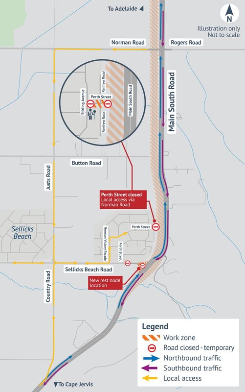 From Tuesday 18 November until Sunday 7 December 2025, Sellicks Beach Road between Main South Road and Forth Street will be closed 24 hours a day. During this time, all traffic travelling north and south will detour via Norman Road and Justs Road. Access to local properties and businesses will be maintained at all times.