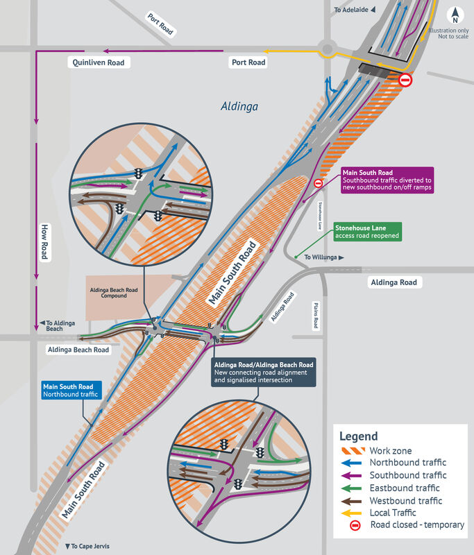 During this temporary closure, all southbound traffic from Port Road will be access Main South Road via How Road and Aldinga Beach Road. Please see map below for more information.