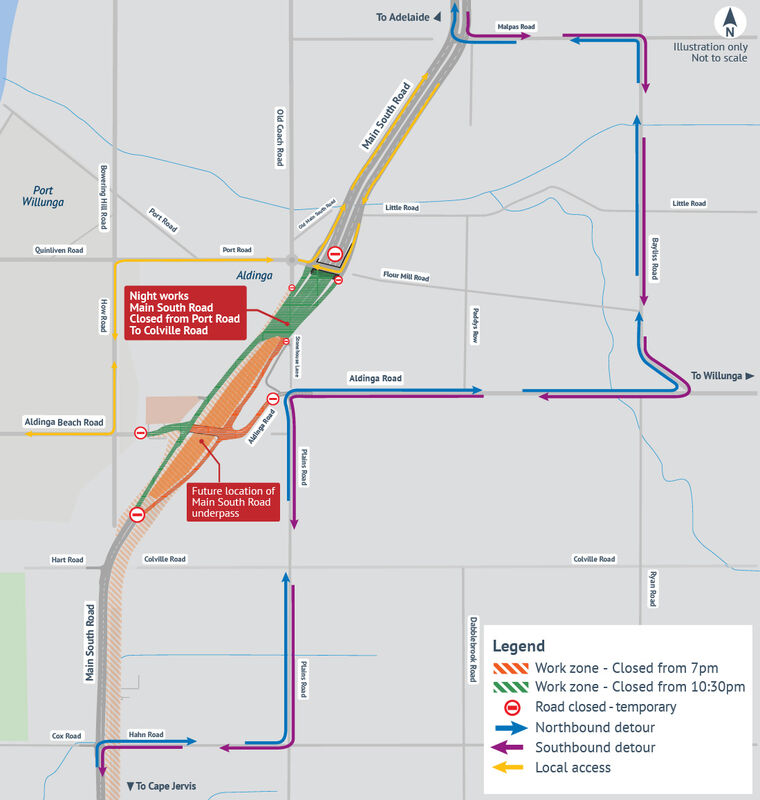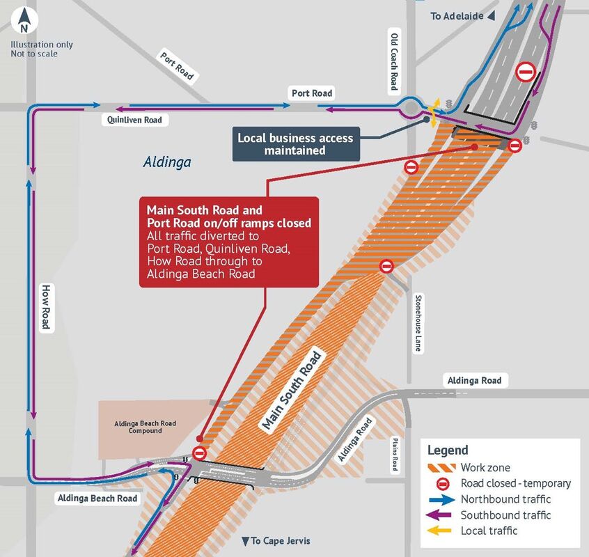 From 7pm Sunday 28 September 2025, Aldinga Road between Main South Road and Plains Road will be temporality closed.From 8:30pm Sunday 28 September, Main South Road between Port Road and Colville Road will also temporality close. During this time a detour will be in place via Malpas Road, Bayliss Road, Aldinga Road, Plains Road and Hahn Road.During the week commencing Monday 29 September southbound traffic will begin using the new on and off ramps, weather permitting.